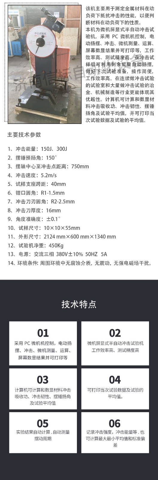 按照 GB/T3808-2018 (擺錘式?jīng)_擊試驗機的檢驗)及 ISO148-2(金屬材料擺錘式夏比沖擊試驗第二部分,試驗機檢定)、ASTM E23 相關標準生產制造符合 GB/T229-2020(金屬夏比缺口沖擊試驗方法)、ISO148 (金屬材料擺錘式夏比沖擊試驗)、JJG 145-2007 (擺錘式?jīng)_擊試驗機檢定規(guī)程) 四、主要技術指標: 1、沖擊能量:150J、300J 2、擺錘預揚角:150° 3、擺軸中心至沖擊點距離:750mm 4、沖擊速度:5.2m/s 5、試樣支座跨距:40mm 6、鉗口圓角:R1-1.5mm 7、沖擊刀刃圓角:R2-2.5mm 8、沖擊刀厚度:16mm 9、角度準確度:±0.1° 10、試樣尺寸:10×10×55mm 11、外形尺寸:2124 mm×600 mm×1340 mm 12、試驗機凈重:450Kg 13、電源:交流三相 380V±10% 50HZ 5A 14、環(huán)境條件:周圍環(huán)境中無腐蝕介質,無震動,無強電磁場干擾。 五、設備主要配置: 1、300焦耳主機一臺; 2、150J、300J 擺錘各一個 3、取擺傳動裝置一套(裝在主機上) 4、自動掛擺裝置一套(裝在主機上) 5、保險機構一套(裝在主機上) 6、安全防護裝置一套 7、擺錘拆卸器一只 8、支座調校器一只 9、試樣對中器一只 10、聯(lián)想打印機一套 11、專用測量軟件一套 測控部分說明: Windows 平臺, 屏顯,鼠標操作(操作窗口如下); 如果需要輸出實驗報告,需要安裝Microsoft Word或Excel版本至少為Office2003。 軟件支持多個擺錘. 記錄沖擊強度,沖擊能量等.也可計算最大最小平均值和標準偏差。 實驗結果自動計算. 自動測量擺動周期 實驗結果可根據(jù)客戶使用要求,提供通訊協(xié)議,滿足數(shù)據(jù)上傳,實現(xiàn)第三方遠程監(jiān)控