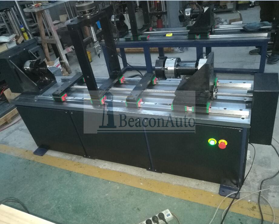主要技術指標 試驗及級別:1級 最大拉伸試驗力: 10000N 最大試驗扭矩: 50 Nm 最大徑向試驗力: 500N 位移最小讀數:0.01mm 位移最大讀數:600.00mm 角位移最大讀數:999.99度 角位移最小讀數:0.1度 最大行程:1200mm 電源:220V 50Hz 扭轉部分: 1.軸流風扇靜態扭轉試驗機項目簡介 扭轉部分是由加載系統、傳動系統、數字式數據采集處理系統及計算機測量控制顯示系統等組成,適用于對軸流風扇靜態扭轉力學的性能測試。該機采用落地臥式結構。計算機屏幕顯示,數字式數據采集控制系統和全數字交流伺服系統組成閉環控制。采用行星擺線針輪減速器傳動,具有加載均勻、穩定、無沖擊現象、數據采集控制準確的特點。 試驗測試功能:Win2000/XP中文操作平臺。使用以圖形為界面的視窗式操作系統,可設定顯示屏幕及操作面板;可設定試驗速度及各種控制參數;可實時顯示基本試驗結果(斷裂值、峰值);可實時顯示試驗過程各種相關參數圖形;可實現系統診斷并顯示診斷結果。試驗機實現分級管理權限。不同的用戶可進入不同的管理界面、分三級用戶管理權限。 整機利用全數字交流伺服控制系統及數字式數據采集處理系統,光電編碼器采集試樣的扭轉角度。 2.目的: 軸流風扇的靜態扭轉實驗 3.軸流風扇靜態扭轉試驗機方案描述 【主 機】采用臥式結構,主體結構采用焊接結構,以保證整機的剛性。夾具采用優質合金結構鋼40CrNiMoA淬火(HRC45~50)方式,主傳動軸采用優質合金結構鋼淬火處理,保證其使用壽命。試樣的安裝、拆卸方便、快捷。 【驅動系統】由全數字交流伺服控制系統驅動。速度調節范圍寬,加載均勻、穩定。 【傳動系統】采用行星擺線針輪減速器傳動,保證傳動的均勻、穩定及傳動精度。縱向空間可以根據汽車半軸的規格進行調整,橫向空間根據驅動橋的規格任意手動調節。 【測量顯示系統】該機采用光電編碼器采集試樣的扭轉角度,高精度扭矩傳感器采集試樣的扭矩。計算機屏幕顯示試樣的扭矩、扭轉角度、扭轉剛度以及各類曲線等。 【軟件操作】 ★控制模式采用智能專家設置系統,用戶可以根據自己的實際要求編制試驗過程控制方式,自動完成試驗。 ★ Windows2000/XP全中文界面,人機對話方式。試驗的全部操作均借助CRT,通過計算機鍵盤與鼠標完成,計算機屏幕顯示試驗扭矩T,扭轉角度θ,扭轉次數,各種試驗曲線(扭矩-時間曲線、扭矩-角度曲線、角度-時間曲線等)試驗機工作狀態等。 ★曲線坐標的大小可以根據實際的試驗數據進行調整。 ★輸出打印各種試驗報表格式(報表格式可以Excel或Word格式輸出)。 ★符合JB/T9370—1999《扭轉試驗機技術條件》及GB10128—88《金屬室溫扭轉試驗方法》數據處理的相關要求。 ★可以設定以正弦波或方波的方式進行循環加載。 ★ 試驗過程可以實現模擬再現。 ★ 可以任意多條試驗曲線疊加對比、輸出打印。 ★ 可以進行數字化調零和標定。 ★ 試驗數據采用數據庫管理方式,便于查詢和維護。 ★ 軟件系統的操作可以實現三級用戶管理,安全、方便、快捷。 【安全保護系統】過載保護、過電流、過電壓保護、超速保護、工作值保護、行進保護等。 4.主要技術性能指標: 4. 1大輸出扭矩:±50Nm;測量范圍:±0.1~±50Nm 4. 2驗扭矩示值相對誤差:±1% 4.3試驗扭矩重復性相對示值誤差:≤1% 4.4扭矩測量范圍:1%~100% 4.5縱向空間:0~1200mm可調 4. 6轉角度分辯率:0.10; 4. 7加載方式:可以設定以一定速度或扭距進行持續加載。 4. 8加載速度:0.005~3r/min任意設定 4. 9加載控制精度為:±2% 4. 10壓電壓:AC380V 50Hz 5.軸流風扇靜態扭轉試驗機功能要求: 5.1系統集成、加載、操作運行控制由計算機控制,試驗過程的數據采集、記錄由計算機完成,可以實現試驗數據回放,報表輸出; 5.2加載量在設備性能指標的范圍內連續可調穩定輸出; 5.3試驗控制操作集中在控制臺(柜),采用單人坐式操作;試驗件安裝調整符合操作人員立式操作的要求;試驗工裝需要必要的旋轉功能,方便主減齒輪試驗時主減速器的安裝、拆卸; 二軸向及徑向加載部分 1.1全數字交流伺服電機和伺服驅動器,調速比可達1:30;該系統控制精度高、穩定性好,運行平穩可靠、響應快、噪音低,并具有過載、過流、過壓、欠壓、過熱、 異常停止、故障報警等齊全的保護功能,并可根據不同的機型和試驗類型調整參數,使伺服系統運行在最佳狀態,使用了伺服系統的位置控制方式,接口單元實現了數字化,克服了速度環帶來的零漂移和低速不穩定。 1.2 采用精密絲杠和精密減速機構傳動,傳動平穩、噪音低,無間隙。 2、軸流風扇靜態扭轉試驗機測控系統、操作軟件及數據處理系統 高精度數據采集板(24位A/D數據采集)可實現全數字化調整、高精度放大及精確控制(內置于計算機內),先進的芯片集成技術,高精度±300000碼采集卡,使傳感器的測量精度發揮到極致。具有集成度高、穩定可靠、使用方便等優點。控制軟件能實現自動求取彈性模量、屈服強度、抗拉強度、斷裂強度等常規數據,能自動計算試驗過程中任一指定點的力、應力、位移、變形等數據結果。 2.1 自動清零:試驗開始后,測量系統自動調零; 2.2 自動停機:試樣斷裂后,移動橫梁自動停止; 2.3 自動標定:系統可自動實現示值準確度的標定; 2.4 自動存盤:試驗數據和試驗條件自動存盤,杜絕因忘記存盤而引起的數據丟失; 2.5 自動變速:試驗過程中橫梁移動速度可