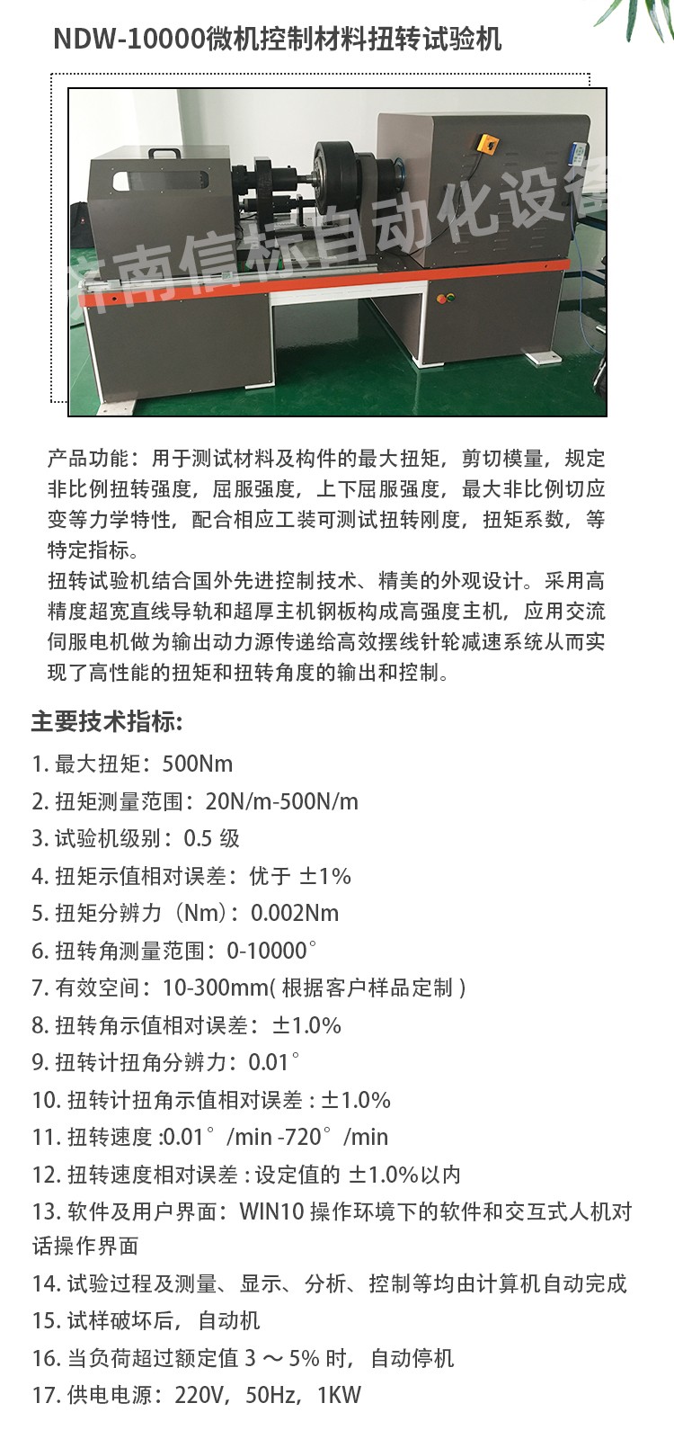 滿足及參考標(biāo)準(zhǔn): 1. GB/T2611-2007《試驗機通用技術(shù)要求》 2. GB/T10128-1998/2007 《金屬室溫扭轉(zhuǎn)試驗方法》 3. ISO7800-2003金屬材料單軸扭轉(zhuǎn)試驗方法 4. ASTM A 938-2004金屬線扭轉(zhuǎn)試驗方法 5. ASTM A938-07 鋼絲扭轉(zhuǎn)試驗的試驗方法 用于測試材料及構(gòu)件的最大扭矩,剪切模量,規(guī)定非比例扭轉(zhuǎn)強度,屈服強度,上下屈服強度,最大非比例切應(yīng)變等力學(xué)特性,配合相應(yīng)工裝可測試扭轉(zhuǎn)剛度,扭矩系數(shù),等特定指標(biāo)。 構(gòu)成高強度主機,應(yīng)用交流伺服電機做為輸出動力源傳遞給高效擺線針輪減速系統(tǒng)從而實現(xiàn)了高性能的扭矩和扭轉(zhuǎn)角度的輸出和控制。 控制系統(tǒng)采用世界流行的高速PCIE標(biāo)準(zhǔn)并行總線設(shè)計,采用美國BB公司放大器,AD公司的高速模數(shù)轉(zhuǎn)換器及CPLD構(gòu)成數(shù)據(jù)采集系統(tǒng)及高精度扭矩傳感器構(gòu)成測量控制系統(tǒng)??刂破骺蓴U展支持,LAN USB CAN等通訊方式。 試驗機專業(yè)軟件可實現(xiàn)自動求取最大扭矩、抗扭強度、上下屈服扭矩、規(guī)定非比例扭矩、切變模量等數(shù)據(jù)和指標(biāo),計算機控制系統(tǒng)對試驗過程的控制和數(shù)據(jù)處理符合相應(yīng)國際標(biāo)準(zhǔn)的要求,多種數(shù)據(jù)輸出方式,標(biāo)準(zhǔn)報表,Excel,word,開放式數(shù)據(jù)庫MDB及原始數(shù)據(jù)源txt形式本機無污染、噪音低,效率高,具有較寬的調(diào)速范圍。本機適用于各種金屬、非金屬及復(fù)合材料的力學(xué)性能指標(biāo)的測試,完全符合國家相關(guān)標(biāo)準(zhǔn)的要求。 結(jié)構(gòu)組成 加載單元:采用行星減速機作為減速單元配置伺服電機加載,減速機定制采用零背隙結(jié)構(gòu),此結(jié)構(gòu)可保證在扭轉(zhuǎn)過程中,無系統(tǒng)間隙,除滿足常規(guī)靜態(tài)測試外還可進行低周疲勞,過零時(扭矩從正向最大減小到零在反向加載到最大的中間過程為過零,)可保證曲線的完整性和數(shù)據(jù)的準(zhǔn)確。